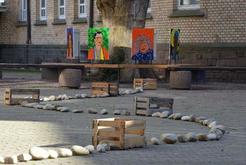 Das Bild zeigt die „Bank der Begegnung“ um die Platane auf dem Schulhof. Bank und Bilder wurden von Schülerinnen gestaltet. Die Darstellungen zeigen Frauenfiguren aus der Geschichte und wurden aus Anlass der Verlegung unserer „Stolpersteine“ geschaffen.