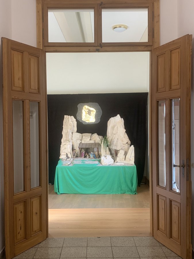 Die liebevoll gestaltete Weihnachstkrippe wird bis Weihnachten immer wieder neue Figuren erhalten. Wenn ihr entdecken wollt, was jeden Tag neu dazukommt, schaut vor unserer Schulkapelle im A-Bau vorbei.
