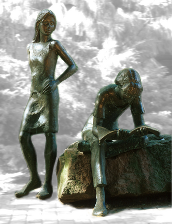 Das Bild zeigt die vom Künstler Martin Schöneich entworfenen Mädchenfiguren auf dem Schulhof.