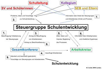 Die Steuergruppe ist ein Gremium, das durch Beschlüsse der Gesamtkonferenz (auf der die Schulleitung, die Lehrerschaft, sowie Eltern- und Schülerinnenvertreter zusammenkommen) Aufträge erhält und diese besprechen, bearbeiten und steuern.