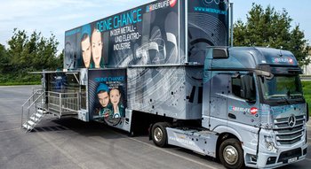 Gegen 18 Uhr finden sich die SchülerInnen sowie DozentInnen - alle ausgestattet mit einem Stapel Gutscheinen - auf den Hof ein, denn dort ist für Stärkung gesorgt: Bei Spießbratenbrötchen, Pastramiburgern, Veganem Curry, liebevoll zubereitet von Frau Bachl und Frau Kern, Flammkuchen, Bratwurst bleiben keine Wünsche offen. Süßes zum Nachtisch gefällig – auch kein Problem. Die Schülerinnen der MSS12 haben 52!! Kuchen gebacken und natürlich war auch Roberto mit seinem Eiswagen da. Während die Schlangen immer länger werden, nutzen viele Schülerinnen und Schüler sowie deren Eltern die Möglichkeit, den zweistöckigen MINT-Truck der Metall- und Elektroindustrie, der in der abgesperrten Glacisstraße vor der Schule steht, zu besuchen. Hier werden die unterschiedlichen Berufe und Ausbildungsmöglichkeiten der Branche vorgestellt. Außerdem können die SchülerInnen einen Roboterarm oder eine Metallfräse programmieren. Weitere Berufsorientierung findet „am Kreuz“ statt, dort präsentieren sich die Firmen, Hochschulen und Universitäten und nutzen den Tag Informationen an die Ausbildenden und Studierenden von morgen loszuwerden.