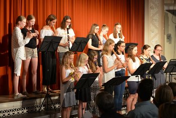 Das Besondere am Blockflöten-Ensemble ist, dass dort Mädchen von der 5. bis zur 13. Klasse – also auch „ganz Kleine“ bis „ganz Große“ – miteinander musizieren und Spaß haben.